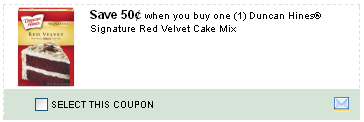 Meijer has Duncan Hines Cake Mix $1.25 starting 1/10 for Thursday Markets. There is a coupon for the Duncan Hines Red Velvet Cake. With doubles it makes it $.25!