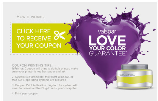Starting today, head on over to the Valspar Facebook Page, “like” them, and follow directions in the most recent wall post to get a coupon for a FREE 8 oz. Valspar Paint Sample at Lowes. Offer good to the first 150,000.