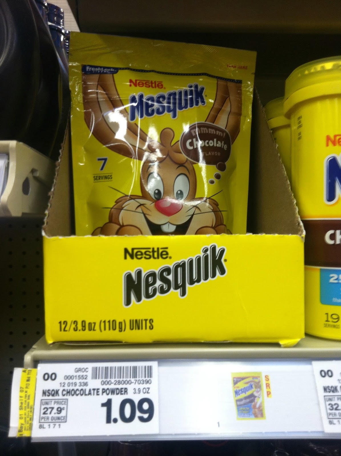 Nesquik is priced at $1.09 and you can use the $0.50/1 Nestle Nesquik Powder or Syrup, exp. 4/14/13 (RP 02/17/13) to get a 7 serving pack for only $.09. This is the everyday price not a sale, so you can grab some anytime.