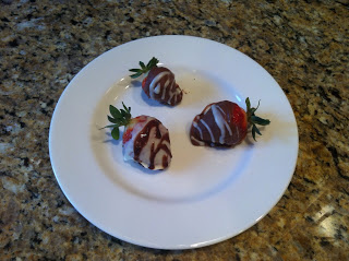 Place strawberries on a cookie sheet covered with aluminum foil and place in freezer for about 5 minutes. If you are doing 2 or 3 kinds of chocolate you can use the leftover to drizzle over the strawberries in different colors. I just use a spoon to drizzle it. The strawberries should be stored in the fridge. They do start to get mushy after 24 hrs. so eat them quick.