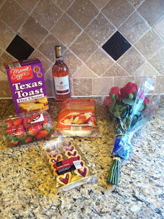 I bought a dozen roses ($9.99), a bottle of White Zinfandel ($2.89), ricotta and romano stuffed shells($1.99), 1 lb. Strawberries($1.29), 5 cheese Texas Toast ($1.69), Shortbread Hearts($1.69).
