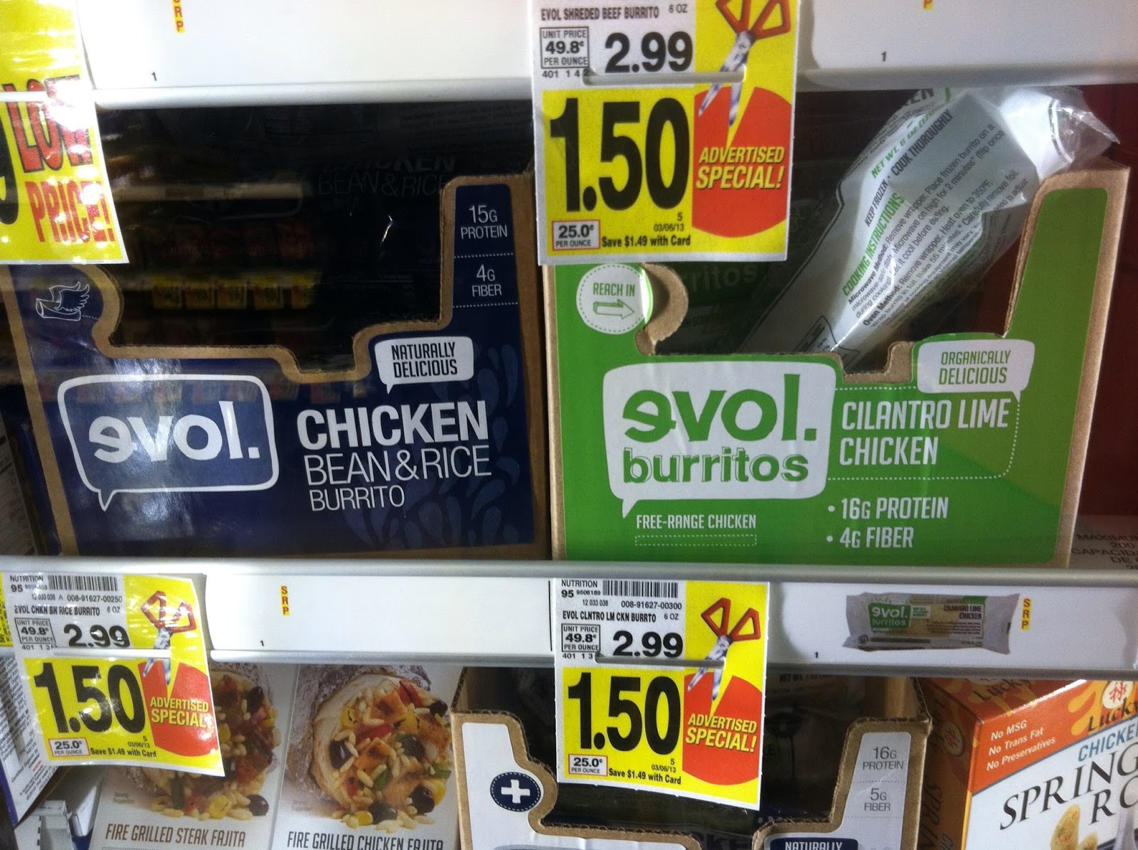 I stopped by Kroger today to see what kind of unadvertised deals they had. They have a great price on the evol burritos. Also they have some good deals if you have Ibotta on your phone.