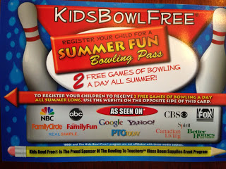 My son just brought home a letter today about the Kids Bowl Free Summer Pass. You can get a pass for up to 6 children to bowl 2 games a day free all summer long. Just go here and click on your state to get started. If you want to bowl with your kids you can purchase a family pass for $24.95. This is for up to 4 adults. You will need to rent or purchase bowling shoes.