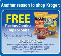 Kroger has a digital coupon for free Tostitos Cantina Chips or Salsa. Go here to clip it. The coupon can only be clipped today, but is good through 6/22.