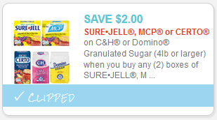 There is a new $2 off Sugar coupon when you buy 2 Sure-Jell, MCP or Certo. I use Sure-Jell in my favorite Strawberry Pie Recipe. You will need to use zip code 62946.
