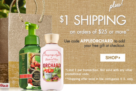 Today only you can get a free full size body lotion and hand wash at Bath & Body Works with any purchase. Just enter the code APPLEORCHARD when you check out. Plus you can also receive $1 shipping when you purchase $25 or more. This deal is valid online only.