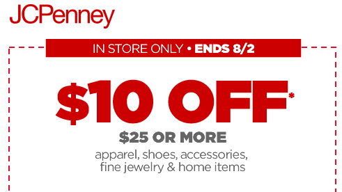 Just a reminder that today is the last day to use the $10 off $25 JCPenney coupon that you can print. Just head over here to grab this coupon. This coupon is good on sale and clearance priced items, too. There are a few exclusions so please read the fine print. Coupon is valid now through August 2nd.