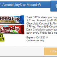 This weekend you can get a free Almond Joy or Mounds from Savingstar. If you are headed out to CVS, Kroger or Meijer just put it on your list. Coupon is valid now through 10/12 at stores that accept SavingStar. I think I will be singing the … Read More...